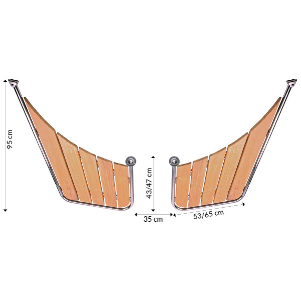 2-delt stævnplatform i AISI 316 rustfrit stål med kvalitets teak passer til spidse agterpartier, f.eks. Nordisk Snekke. Alle platforme har universalbeslag, som passer til de fleste både.