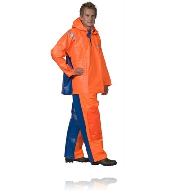 Ocean Gummi busseronne model Crewman Front: 540g PVC/bomuld. Bag: 325g PVC/polyester. Ekstrem slidstyrke kombineret med høj komfort. Løsthængende komforthætte med indvendig snoretræk. Trykknap i halslukning. 3M refleksbesætning på skulder. Farve: Flour. orange/ kongeblå.